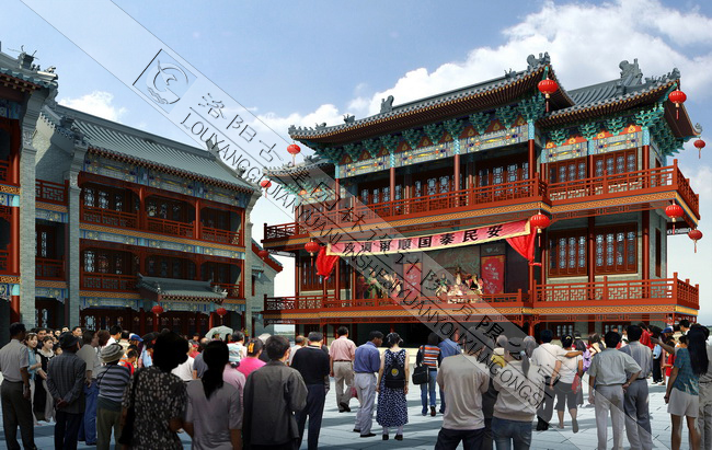祭城古街自北向南設計了四個(gè)段落分區,分別為“祭城掠影”,“歌舞升平”,“鼓樓鐘聲”和“古城遺韻”。